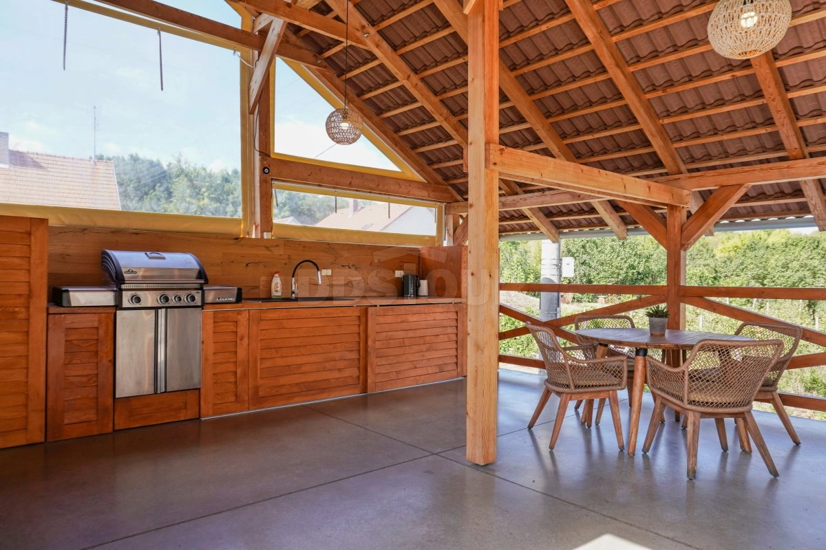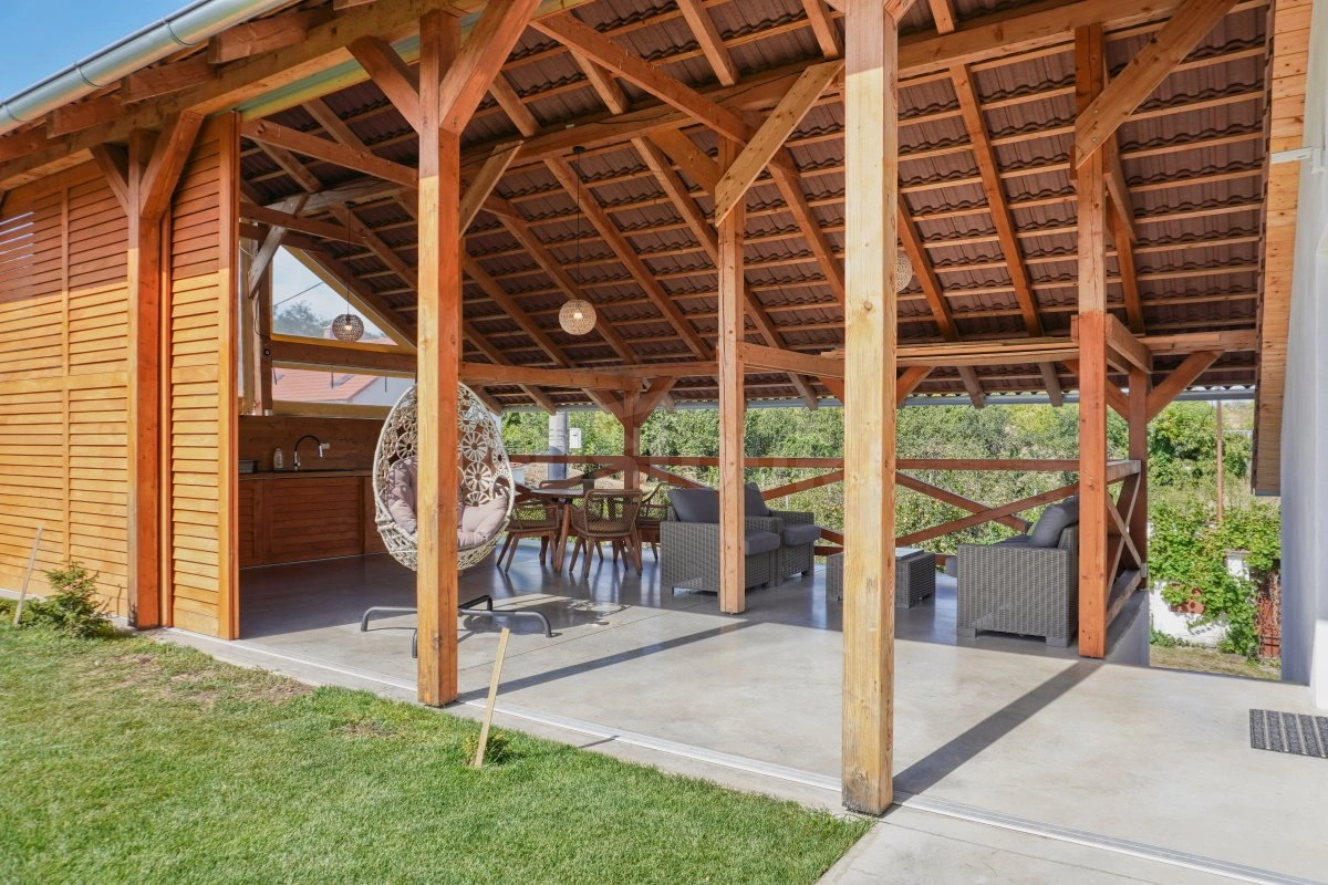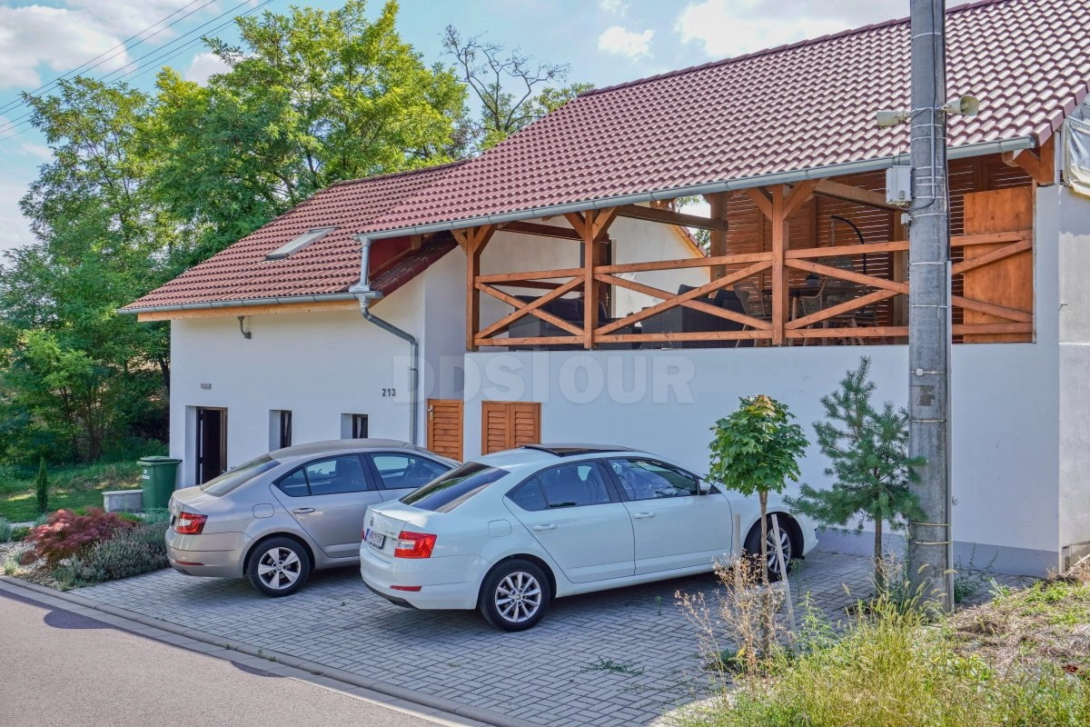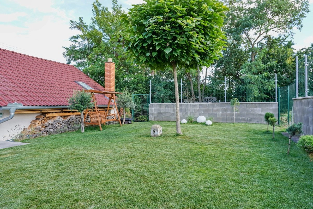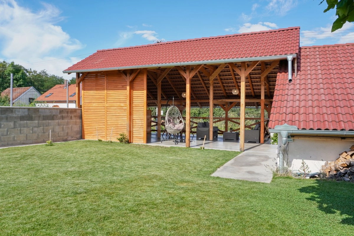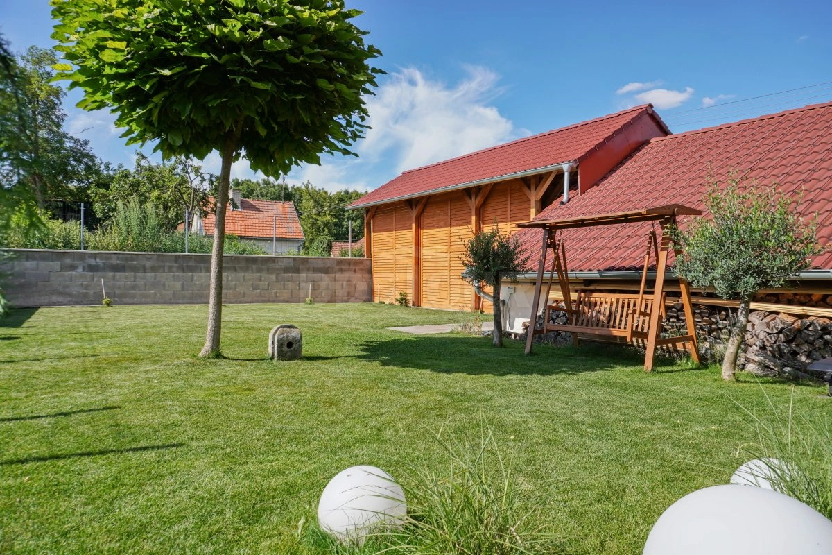 Na oplocené zahradě (200 m²) je pro hosty k dispozici velká zastřešená terasa s posuvnou stěnou do zahrady. Na terase je pro hosty připravena sedací souprava, stůl s židlemi, závěsné houpací křeslo a kvalitně vybavená zahradní kuchyně (plynový gril, lednice s mrazicím boxem, myčka na nádobí, mikrovlnná trouba, kávovar na kapsle Nesspresso, varná konvice a dřez s teplou vodou). Na hezky upravené travnaté ploše za apartmánem se nachází houpací lavice. Neoplocené parkování pro 2 auta u apartmánu.