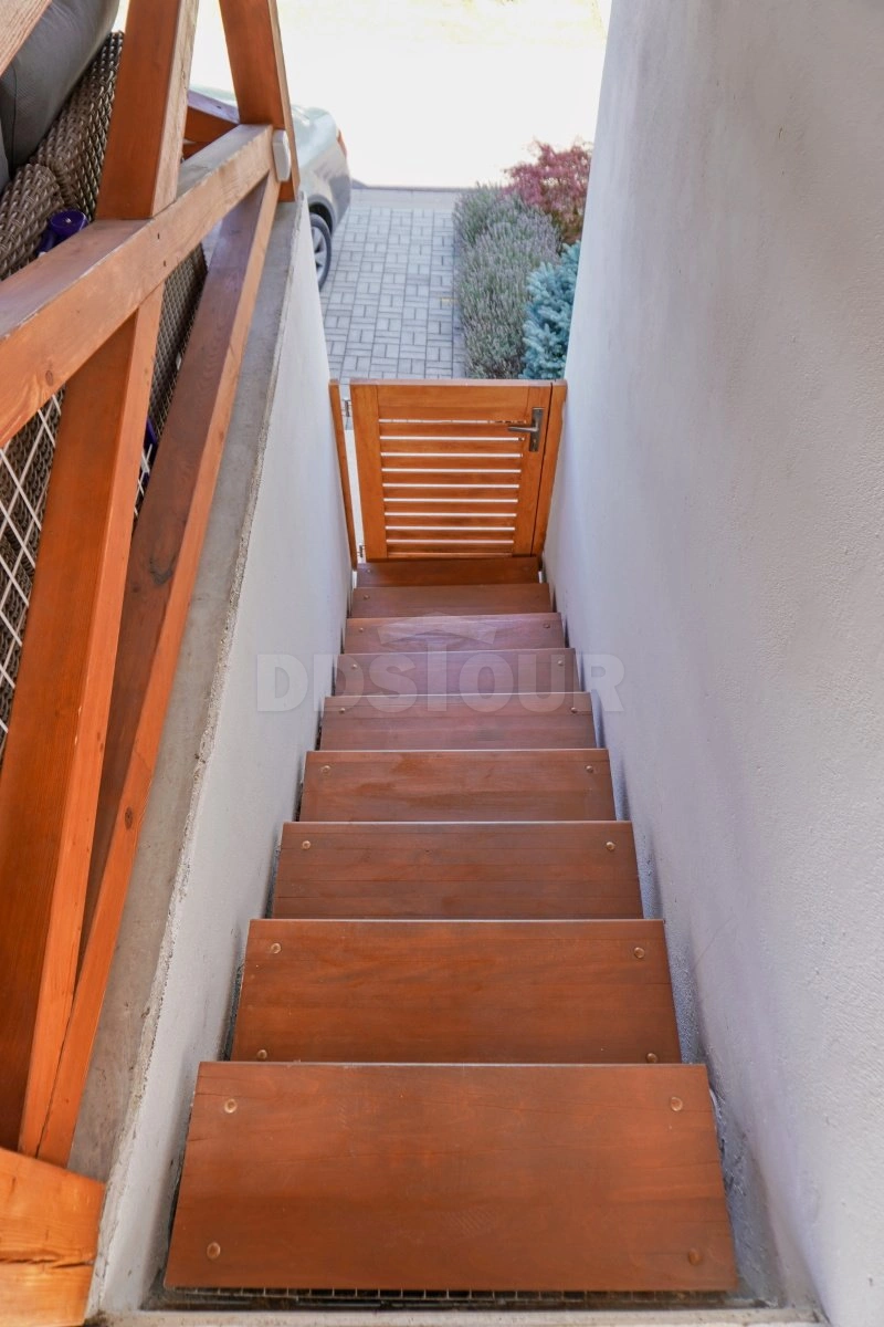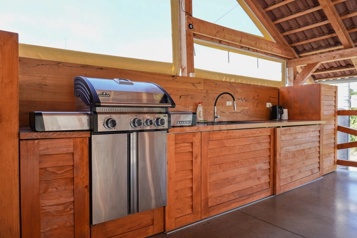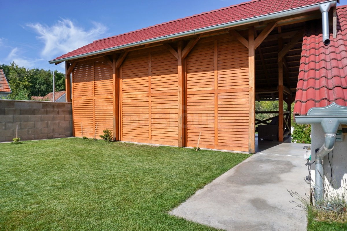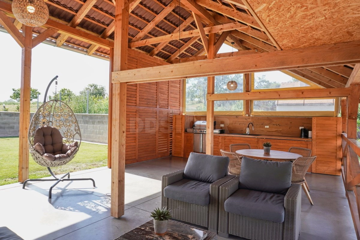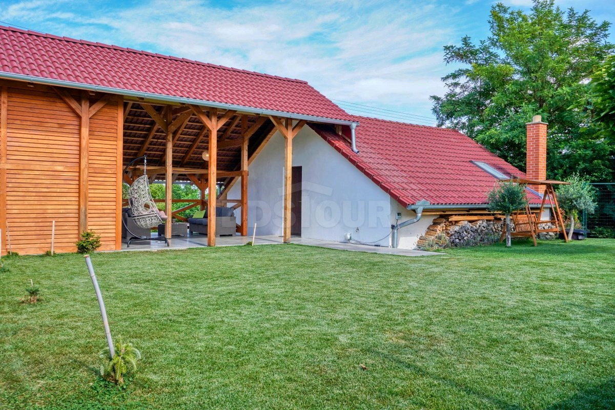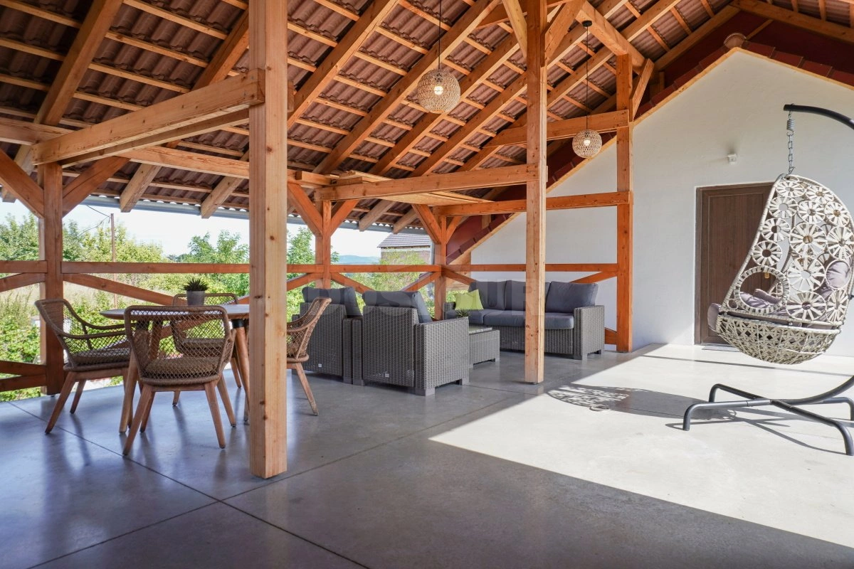 Na oplocené zahradě (200 m²) je pro hosty k dispozici velká zastřešená terasa s posuvnou stěnou do zahrady. Na terase je pro hosty připravena sedací souprava, stůl s židlemi, závěsné houpací křeslo a kvalitně vybavená zahradní kuchyně (plynový gril, lednice s mrazicím boxem, myčka na nádobí, mikrovlnná trouba, kávovar na kapsle Nesspresso, varná konvice a dřez s teplou vodou). Na hezky upravené travnaté ploše za apartmánem se nachází houpací lavice. Neoplocené parkování pro 2 auta u apartmánu.